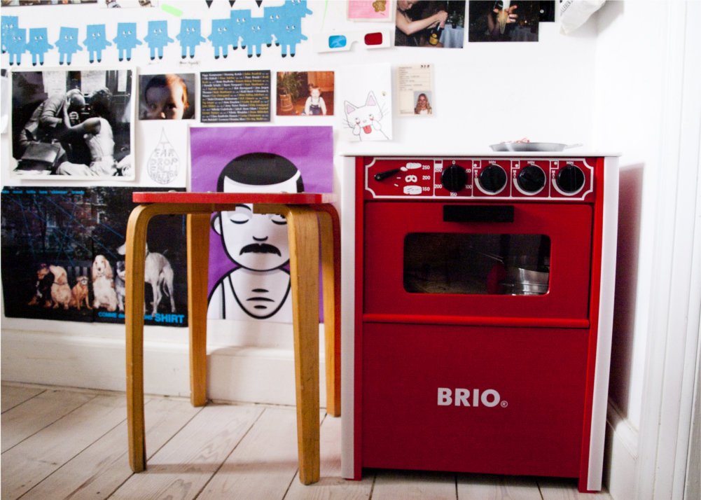 Ich würde unseren Wohnstil als persönlich und farbenfroh beschreiben. Gerne würde sagen, dass ich eine Minimalistin bin, aber das wäre gelogen. Wir haben haufenweise Zeug und das bringt viele Farben und Geschichten mit sich. Ich habe viele Sachen selbst gemacht, beispielsweise unsere Küche, die Ess-Ecke, unser Sofa und das neue Schlaf-Haus im Wohnzimmer. Außerdem haben wir ganz viele Fotos und Kunstwerke von Freunden und Verwandten. Im Wohnzimmer hängen zum Beispiel drei Gemälde von meinem Vater und in der Küche ist eine ganze Wand voll mit Fotos von jedem, den wir kennen.