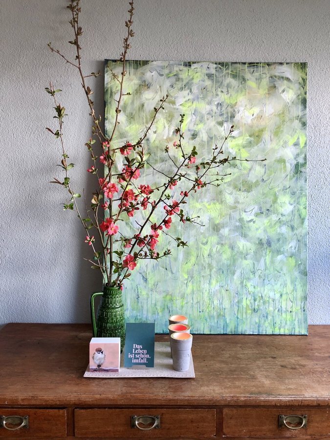 Habe gerade meine Bilder ausgetauscht, das arme Gemälde aus dem dunklen Flur bekommt auch mal einen würdevollen Auftritt. Die Zierquittenzweige in der West-Germany Vase heben sich schön vom leuchtgelb/grünen Hintergrund ab. Der freche Spatz sinniert über die Lebensweisheit, die Betonwindlichter hat mein Sohn gemacht und das feinrosa Steinzeugtablett ich. Geniesst den Tag!