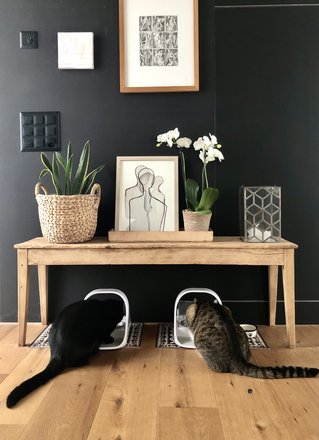 „Wo ist mein Fressnapf?“, fragt sich der Kater irritiert. Fürs Foto mussten die nicht sehr ästhetischen Näpfe weichen. Kommt sicher manchen bekannt vor…