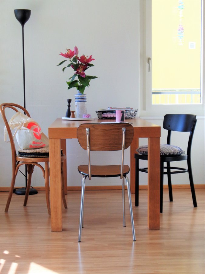 Essplatz, Stuhlmix, Lilienduft, Sonne vor dem Gewitter