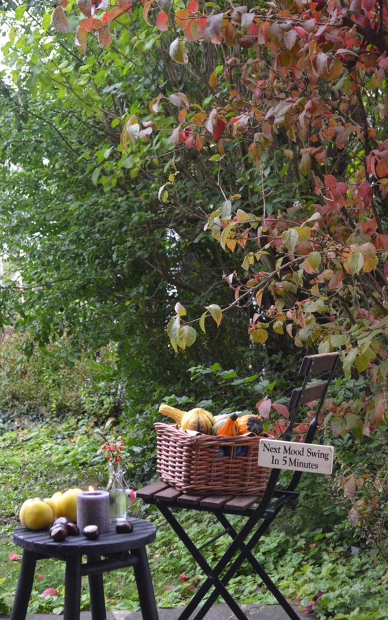 Herbststimmung, Herbstdeko, Gartenblick, Herbstfarben, Zierkürbisse, Quitten, Klappstuhl