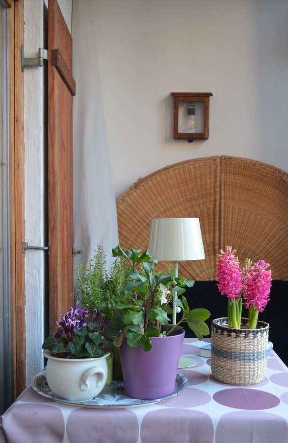 Mitte Januar, Terrassentisch, Sitzecke, Hyazinthe