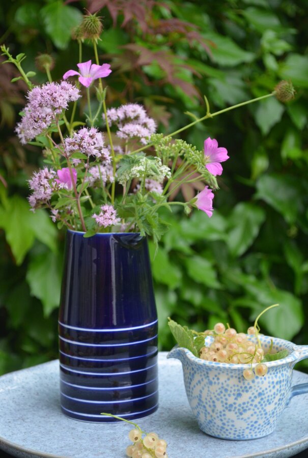 gefüllt mit "Dies-und-Das-Geblümel" vom Gartenwegesrand und weißen (!) Johannisbeeren - warum hatte ich die bloß bisher in unserem Gemeinschaftsgarten übersehen? Sie sind noch besser als die roten - so lecker😋 - und außer mir erntet sie hier anscheinend keiner...