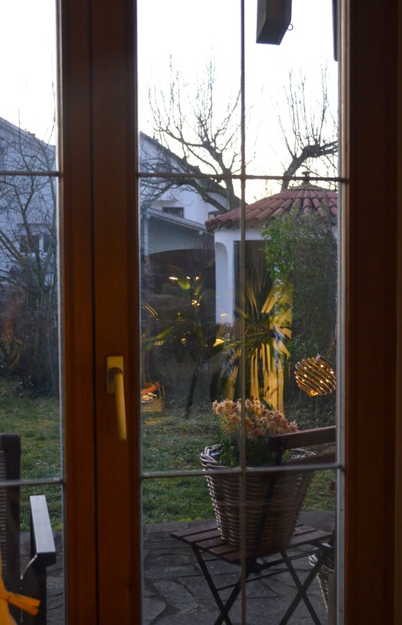 Wohnzimmerausblick, Winternachmittag, Gärtchenblick, Dämmerung