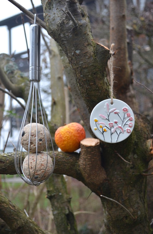 für die Wintervögel im Gärtchen: Ein Schneebesen statt Plastiknetz um die Meisenknödel katzensicher und stabil aufzuhängen. Die Idee ist nicht von mir, habe sie im www entdeckt als ich nach einer schnellen & plastikfreien Lösung suchte, nachdem ich gelesen hatte, dass die Vögel doch viel zu oft kleine Plastiknetzteile mitfressen.