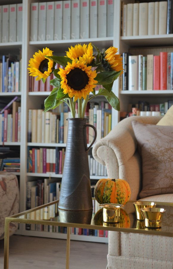 Wohnzimmer, Sonnenblumen, Vintagesofa, Kürbis, Kerzenhalter, Bücherregal, Keramikkrug