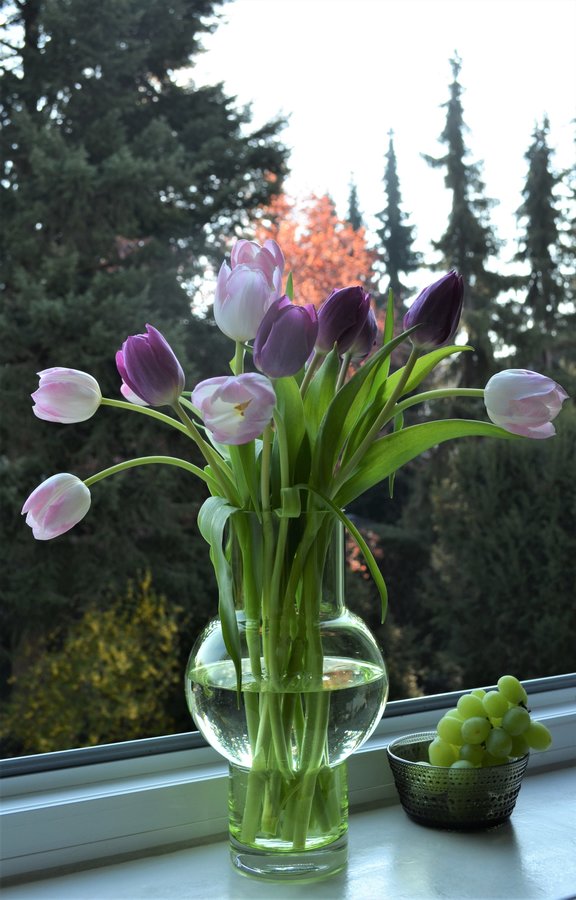 Gartenblick, Tulpen, Weintrauben, Villeroy Boch Vase, Morgensonne