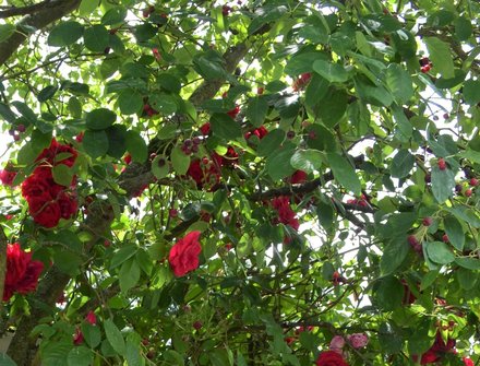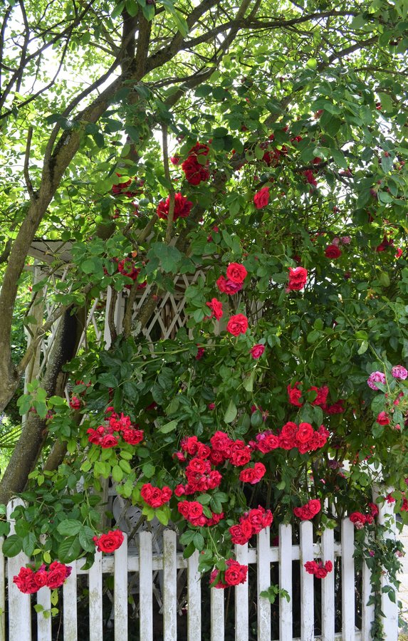 Rosen, Rot, Kirschbaum, Gartenlaube, Gartenimpressionen