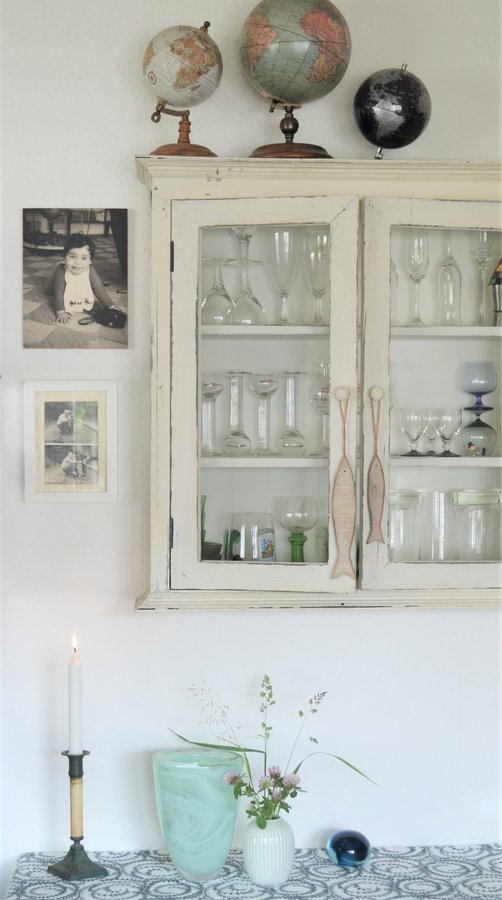Glassammlung, Shabby Vitrine, Kinderfotografie, Nordisch, Wiesenblumen, Globus