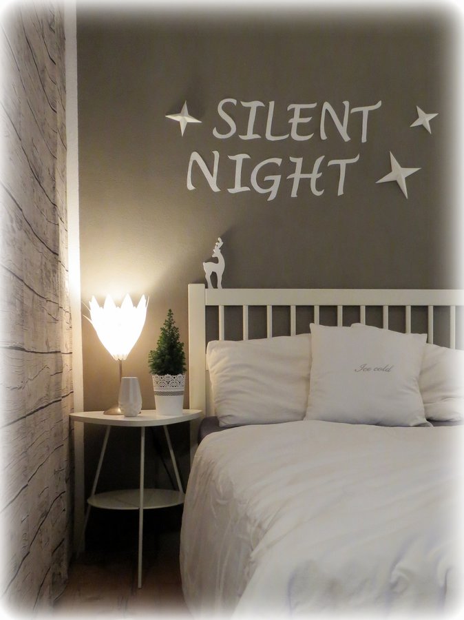 Heute Mittag hab ich fleissig Buchstaben aus Tapeten ausgeschnitten und an die Wand befördert. Das Bett neu bezogen und etwas weihnachtlich dekoriert ! Wie gefällts Euch ?
