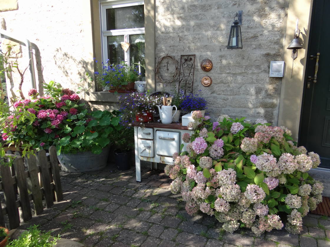 Sommer, Hortensien, alter Ofen, Tür, Eingang