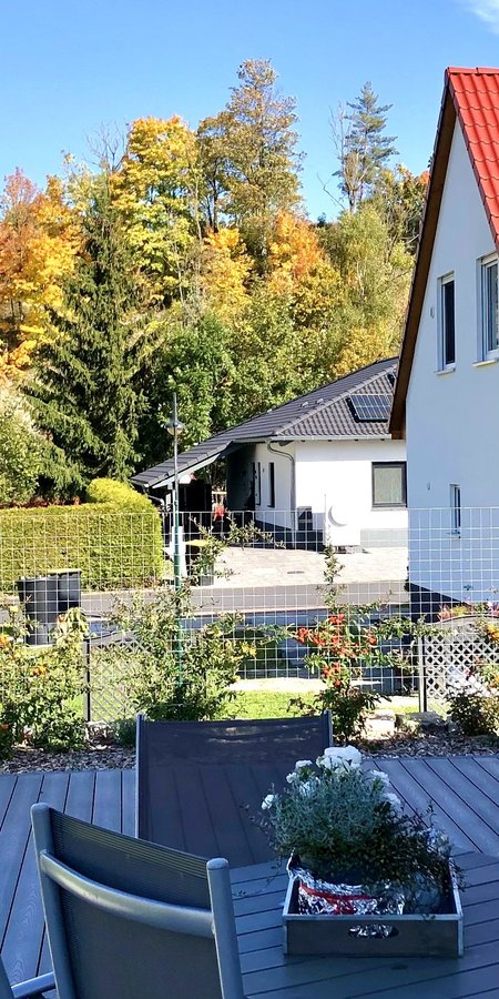 Auf der Terrasse die Sonne genossen, sich über das Wachsen der Sichthecke mit Feuerdorn erfreuen und nach den Enkeln Ausschau halten (Blick auf das Wohnhaus der Jüngsten).
