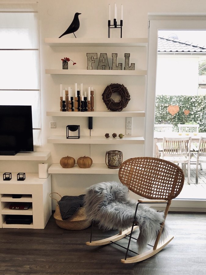 Herbstdeko, Schaukelstuhl, Fell, Kürbis, Kranz, Korb, Kerzenhalter, Wohnzimmer, Regal