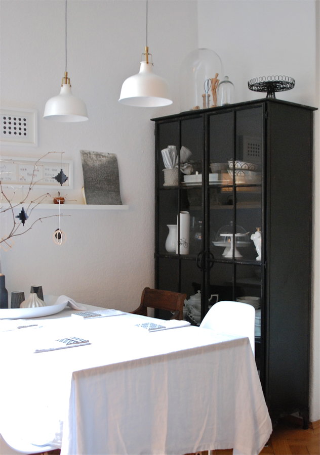 Eames, Eiermann Tisch, Leinentischdecke, Metallschrank schwarz, Geschirr Rosenthal, Stühle Antik