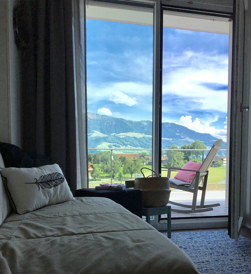 Schlafsofa, Kissen, Balkon, Aussicht, Natur, Sommer, Geniessen, Blau, Grün, Pink