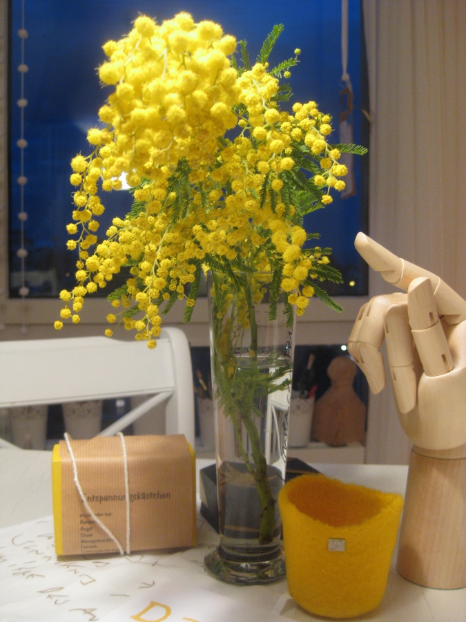 Mimosen, Flügeltisch, Gelb, Filz, Holzkästchen, Schrift