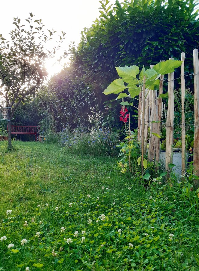 Abendstimmung eben im Garten. Das Gemüse jenseits des Zauns wächst, bei den Tomaten bin ich mir noch nicht so sicher, wie sie den vielen Regen finden, aber die Gurken sind in jedem Falle die Gewinnerinnen.