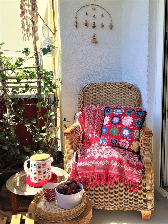 Korbsessel, Teekanne, Camila Engdahl, Teepause, Erdbeeren, Häkelkissen, Diy, Sperrmüll, Midcentury, Korbtablett, Handarbeit, Getöpfert, Hocker, Balkon, Rot, Bunt, Mobile, Flechten, Untersetzer, Häkeln, Hooked Zpagetti