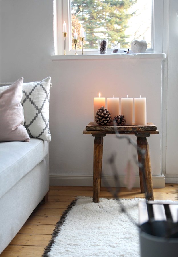 Weihnachten, Adventskranz, Advent, Holzbrett, Zapfen, Adventskerzen, Messingleuchter, alter Schemel, weihnachts deko, Altholz Hocker, Altholz, Puderrosa, Skandinavisch