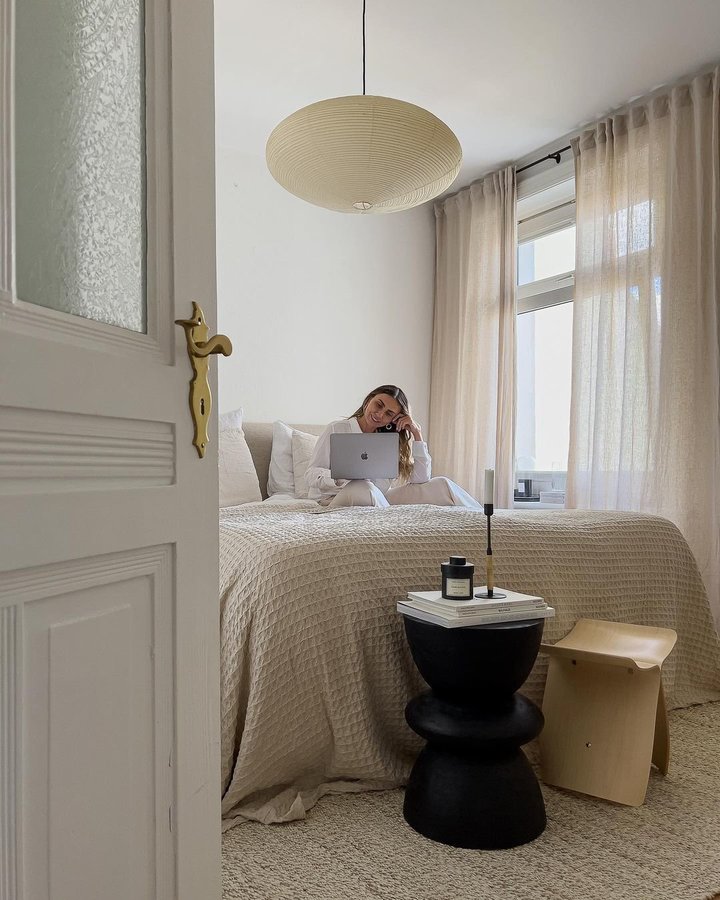 Schlafzimmer, bedroom, Altbau, Altbauliebe, Altbauwohnung, Deko, Tisch, Hocker, Bett, Tür, Interieur, Design, White, Interior, Living, White Living, Interio, Wohnen, Schlafen, Fenster, Vorhänge, Leuchte, Lampe, Kissen, Stuhl, Bücher, Kerze, Kerzenhalter, Dekoidee, Dekoideen, Dekoration, Solebich, Teppich, Decke