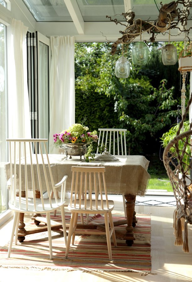 altweibersommer, Wohnwintergarten, DIY Lampe, Leinentischdecke, Holzstuhl, Jugendstil, Vintage, Hängesessel