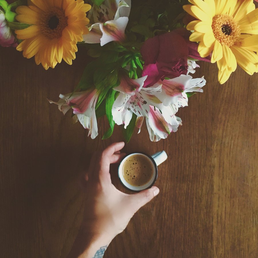 Tasse, Kaffee, Holztisch, Blumen, Deko, Vintage