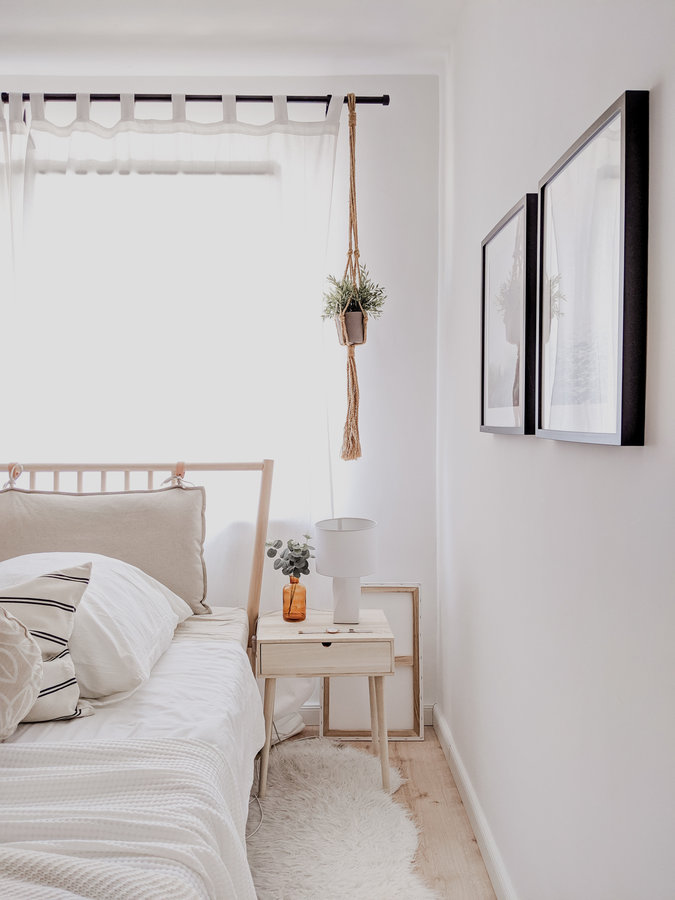 Schlafzimmer, White Living, Blumenampel, Leinwand, Holzboden, Bettwäsche, Fell