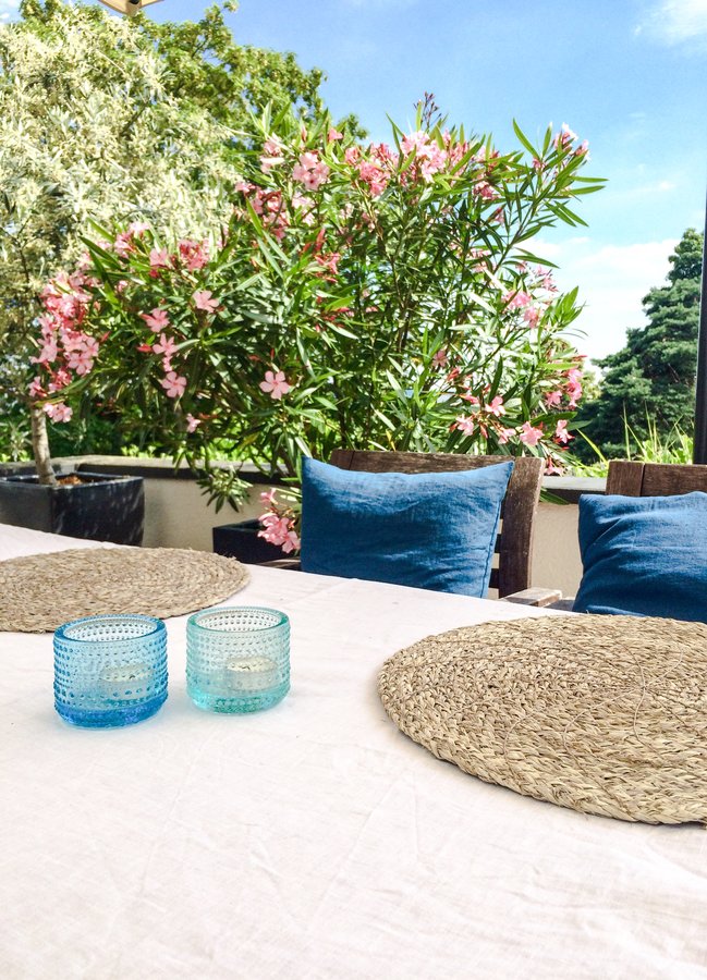 Leinentischdecke h&m, ikea Ramie kissen, Windlicht Iittala
