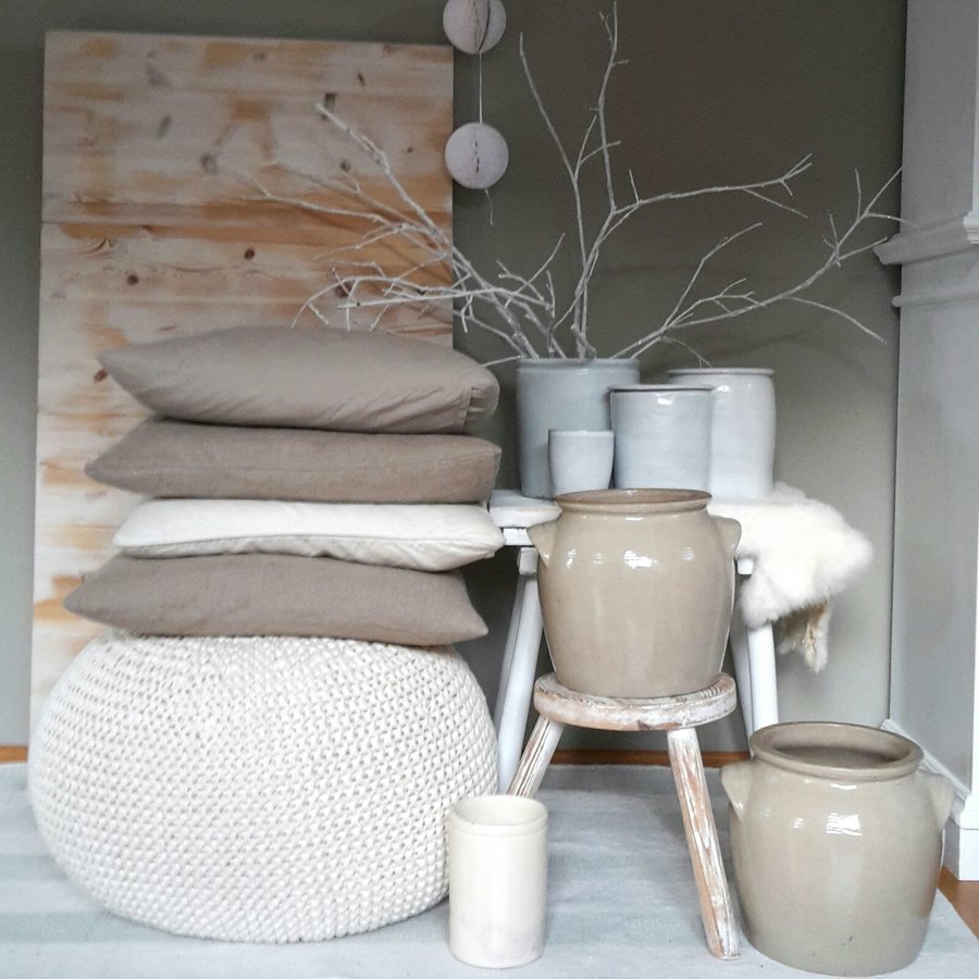 Winterdeko, Kissen, Naturfarben, Schemel, Vase, Pouf, Dekozweig, Topf, Deko