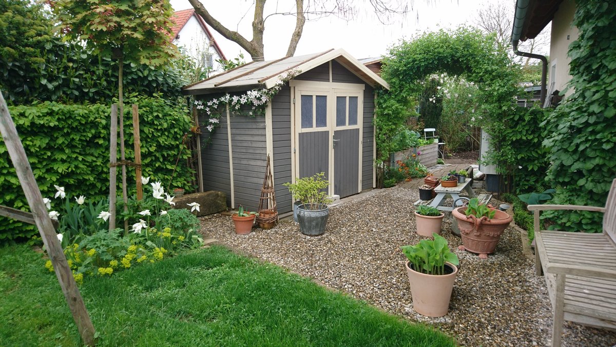 Auf der Nordseite befindet sich unser Geräteschuppen und die Außeneinheit der Wärmepumpe (leider kein Blickfang).