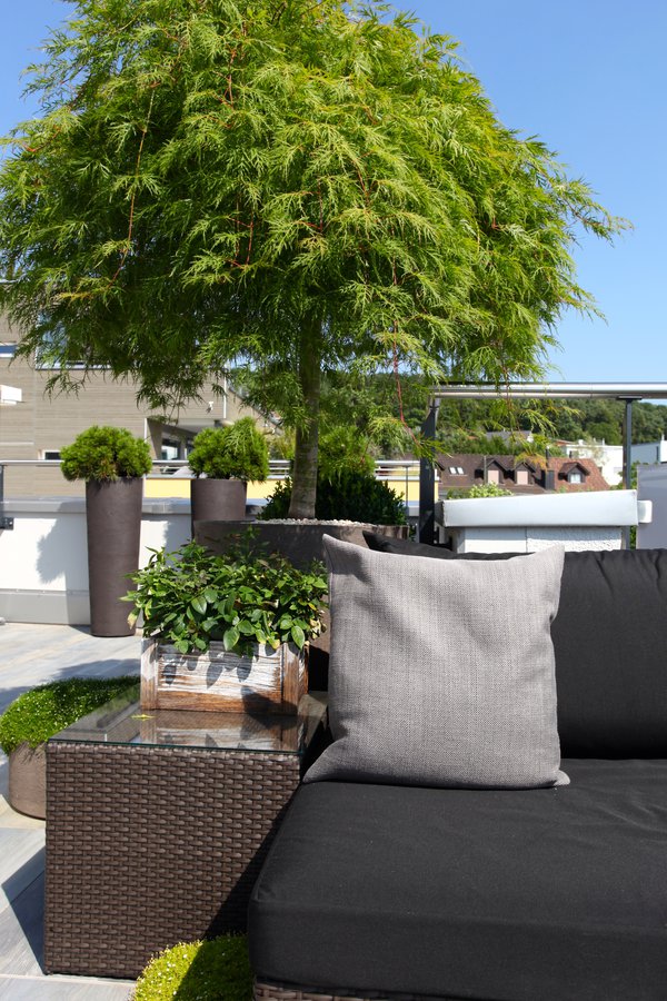 Japanischer Ahorn, Rattanmöbel, Terrasse Garten