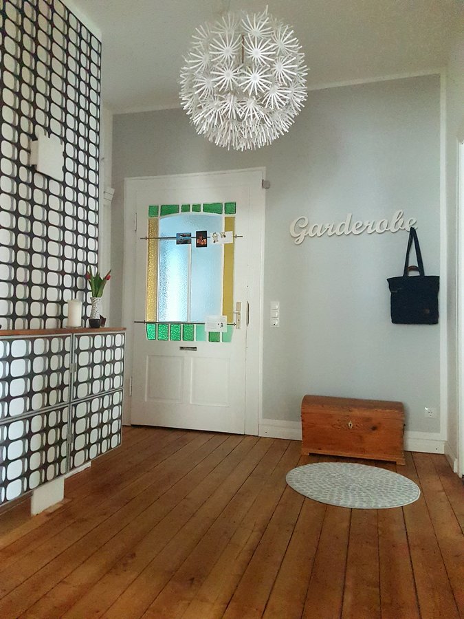 Flur, Tapete, 70er, Ikea Lampe, Manufactum, Garderobe, Ikea Besta, Ikea Hack, Truhe, Wandfarbe, Altbau, Grau, Diele, Dielenboden, Besta, Besta Regal