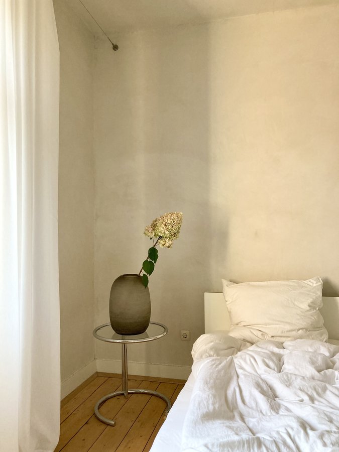 Schlafzimmer, Bett, Bettwäsche, Vase, Blume, Morgensonne, Deko, Altbau, Altbauliebe, Dielenboden