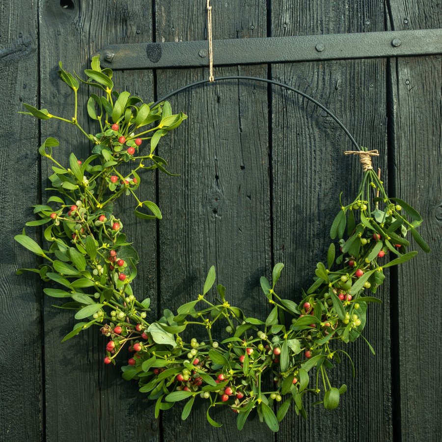 Aus Misteln habe ich diesen Kranz gebunden. Er schmückt jetzt die Türe des alten Backsteingebäudes.