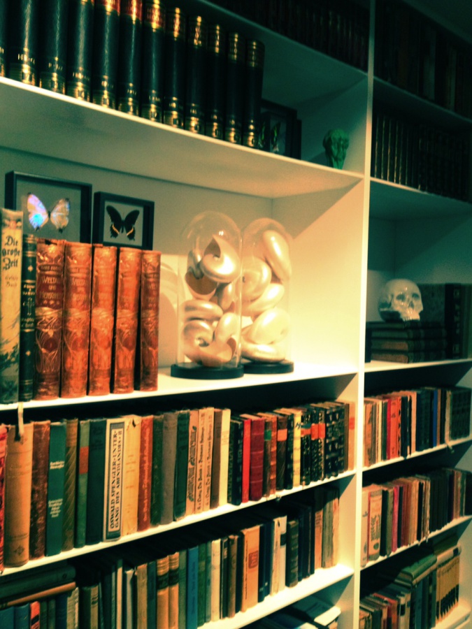 Ich habe Stunden gebraucht bis ich alle Bücher sortiert hatte und bis es so aussah dass die Wand als Dekorationsobjekt auch in den Raum passt. Hier habe ich große Glashauben genommen die ich einfach mit Nautilusschnecken gefüllt habe. Ich liebe den errisierenden Schimmer diser Schnecken und der antike Touch passt zu den alten Büchern die ich von meinem Opa bekommen habe. Zur Auflockerung folgt immer scheinbar willkürlich hier und da ein Dekorationsobjekt welches in der Art oder Anmutung zu den Büchern passen sollte. Die Ecke mit den alten Büchern habe ich mit Schmetterlingen hinter Glas, Totenköpfen aus Porzellan von Seletti und antiken Väschen aus Malachitglas sowie chinesischen Vasen dekoriert auch echte Korallen oder Tierpräperate machen sich gut in dieser Sammlung