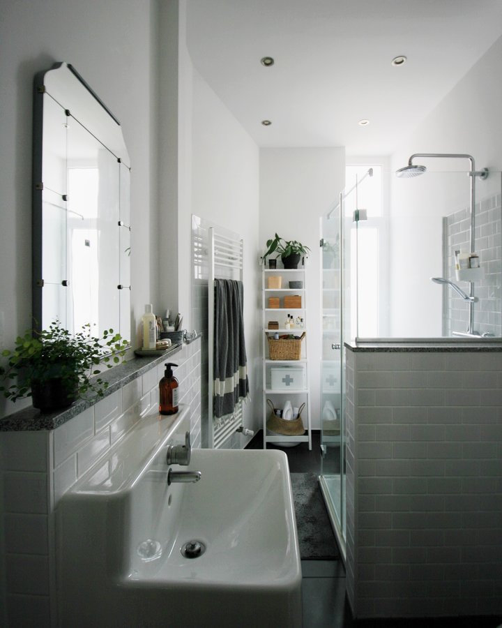 Bad, Badezimmer, Metrofliesen, schwarz weiß, Regendusche, Kleines bad, Badezimmeraccessoires, Badfliesen