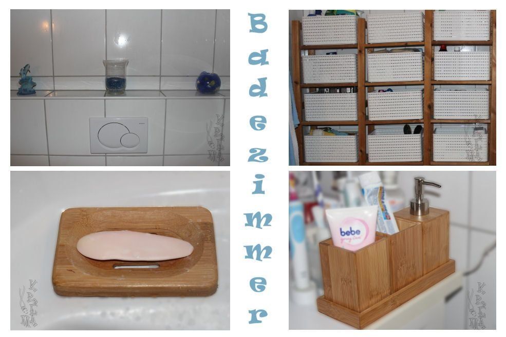 Die blaue Deko wird bald gegen etwas anderes ausgetauscht, da ich dabei bin das Bad umzugestalten und alles in weiß/Natur/beige/hellem Holz einrichten möchte. Die Seifenschalen, der Seifenspender und die Zahnbürstenhalter sind aus Bambus. Die weißen Regalkörbe mit Flechtoptik dienen dazu alles was eine sechsköpfige Familie so braucht ordentlich zu verstauen und doch immer sofort griffbereit zu halten.