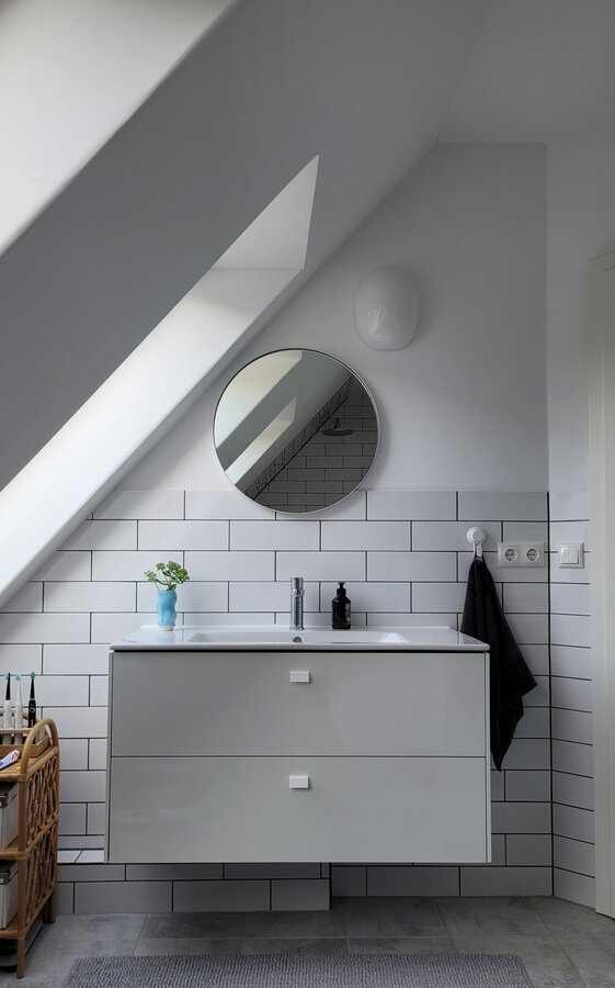 Badezimmer, Dachschräge, Vase, Spiegel, Badschrank, Fliesen
