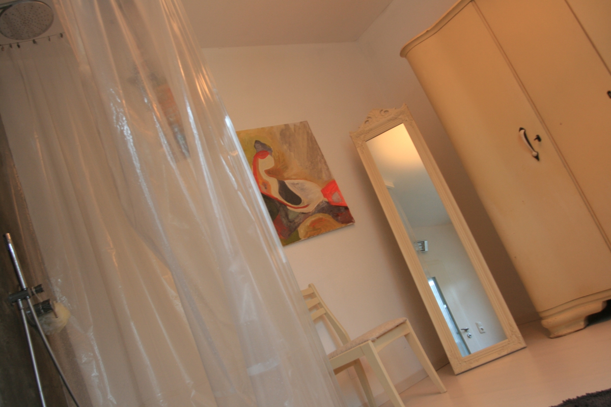 Kleiderschrank aus Omas Zeiten, Holzboden, Standspiegel, neu bezogener Stuhl, Bild selbst gemalt: Eitempera/ Mischtechnik auf Leinwand, Regendusche: Rückwand mit Tadelakt selbst verputzt und geschliffen, Mikrofonhandbrause, Duschvorhang, Trennwand aus Acrylglas