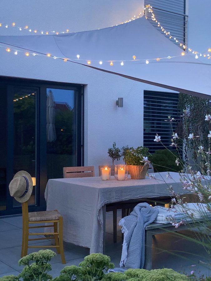 Terrasse, Sonnensegel, Teak, Gartenmöbel, Leinentischdecke, Leinen, Gartenblick
