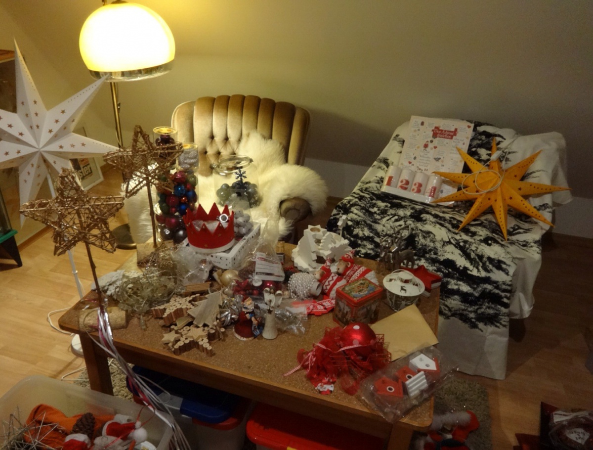 Gerade die Weihnachtsdeko vom Dachboden geholt und zur Sichtung im Gästezimmer ausgebreitet. Sonntag wird dann geschmückt.