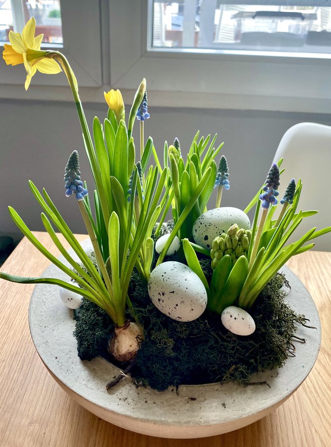 Betonschale, Dekoidee, Deko im Wohnzimmer, Frühblüher, Frühling, Frühlingsblumen, Diy