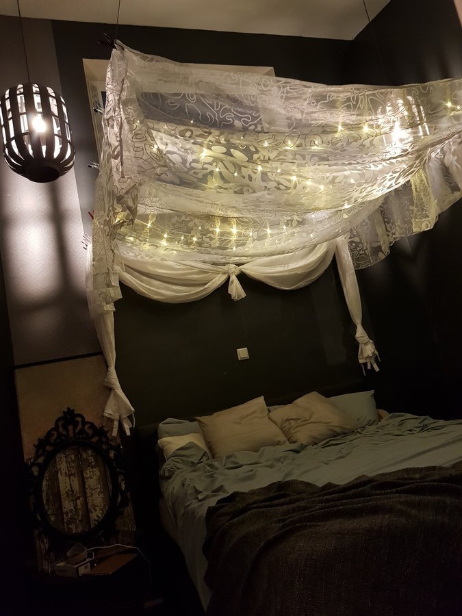 Bettzimmer... dunkle Farben wirken so schön mysteriös heimelig. Und um die ernorme Raumhöhe von 4.10 etwas abzufangen, gibt's einen Himmel zum Wohlfühlen mit Sternenlicht....