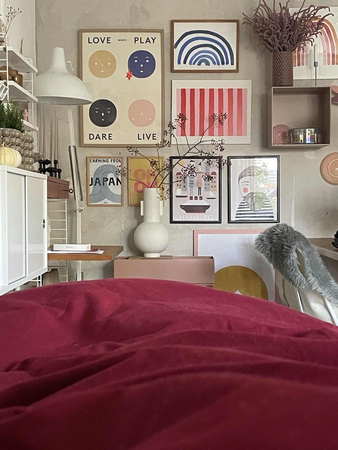 Schlafzimmer, Wohnzimmer, allinone, Gallerywall, artwall, Ikea, String Regal, Ferm Living
