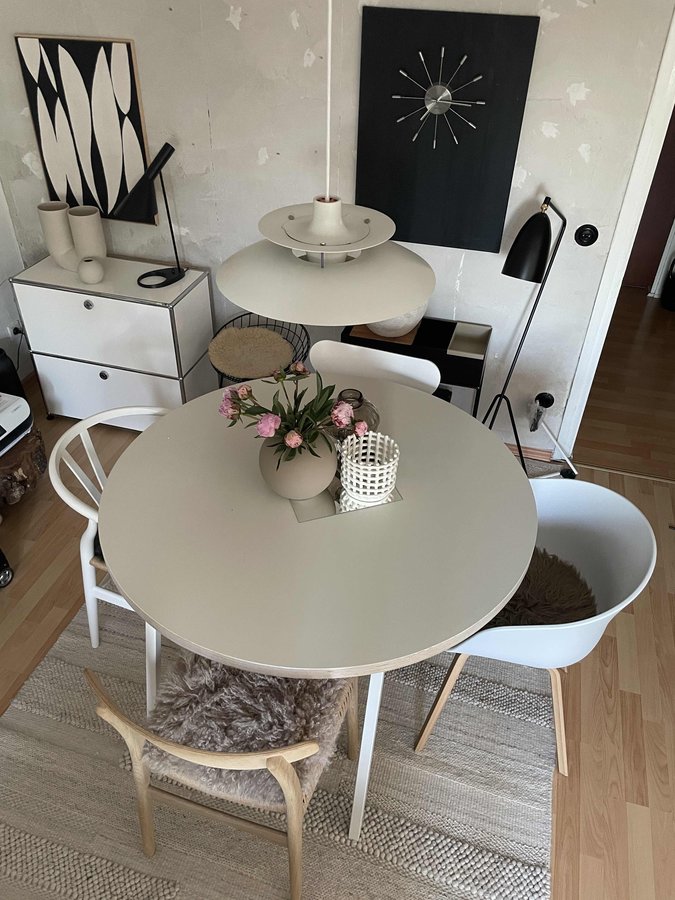 34/23 unser derzeitiger esstisch. wir haben nämlich im winter eine rechteckige eichenholzplatte auf den tischbeinen von hay und im sommer wechsel ich gerne zur runden lackierten multiplexplatte. beide tischplatten hat mir mein papa gefertigt. bei den stühlen mag ich den mix aus verschiedenen modellen total gerne. sie müssen halt weiß oder aus eiche (oder beides😉) sein. und natürlich bequem.