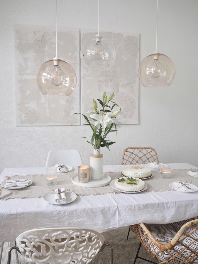 Geburtstag, Kuchen, Esstisch, DIY Tisch, Leinentischdecke, Lilien, Blumendeko, Vasenliebe, Weiss, DIY Bild, Lampen, Kaffeepause
