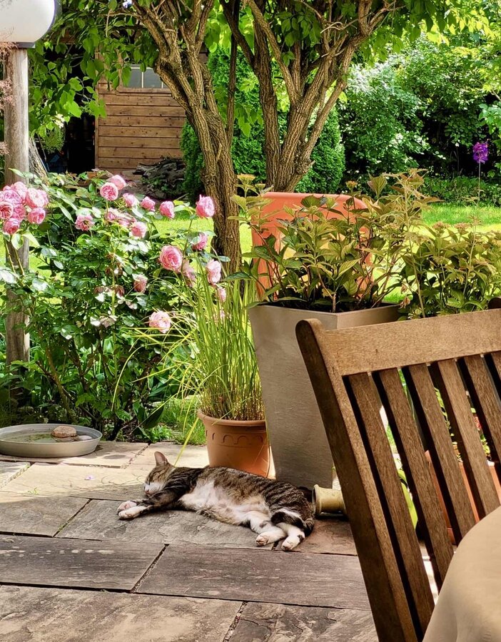 Garten, Terasse, Gartenblumen, Gartenstuhl, Kübel, Töpfe, Rosen, Schuppen, Kater, Sommer, Juni, Wochenende, Sonne, Gartenimpressionen