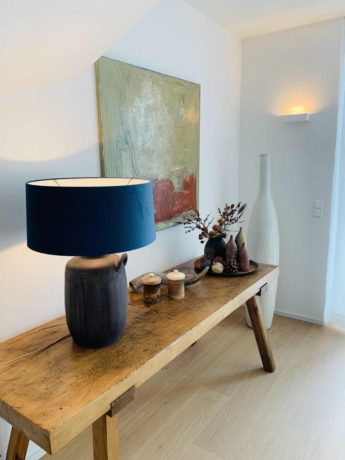 150jahre Antik , 10cm Vollholz, renoviert, geölt, Lampe Tongefäss antik, mit Lampenschirm Samt