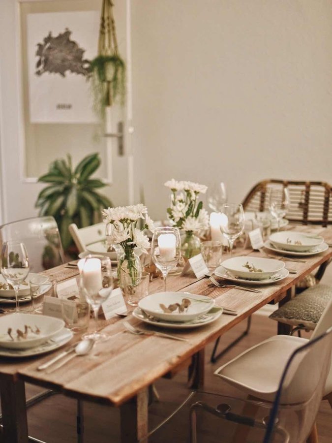 Esstisch, Dinner, gedeckter Tisch, krimidinner, Abendessen, Wohnzimmer, Tisch, Tischdeko