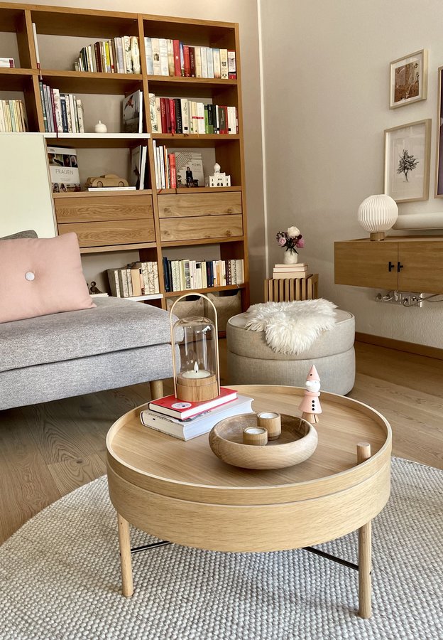 Wohnzimmer, Holztisch, Wollteppich, Sommer, Bücherregal